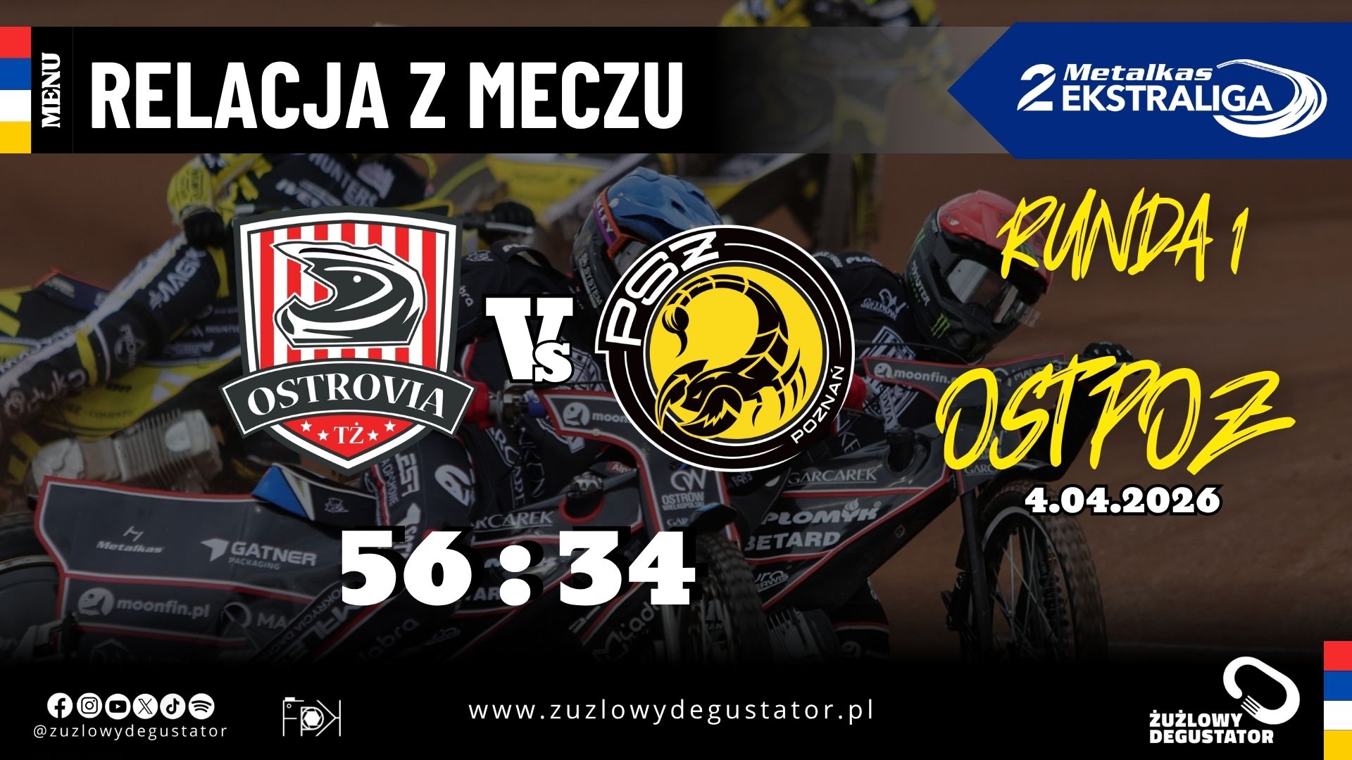W Wielką Sobotę na Stadionie Miejskim przy ul. Józefa Piłsudskiego zmierzyli się ze sobą Moonfin Magnus Ostrów Wielkopolski z Hunters PSŻ-em Poznań. Ostrowianie chcieli zmazać plamę po zeszłorocznej fatalnej batalii ligowej. Wzmocnieni powracającymi do składu po pobycie w ROW-ie Rybnik Chrisem Holderem i Glebem Czugunowem, a także wypożyczonym ze Sparty Wrocław wychowankiem Jakubem Krawczykiem, będą chcieli bardzo mocno wmieszać się w awans do PGE Ekstraligi. Wielkim znakiem zapytania będzie zaś Tai Woffinden wracający po potwornej kontuzji sprzed roku. Zwycięstwo to nie było jednak oczywiste, ponieważ z drugiej strony miały kąsać poznańskie „Skorpiony”. Notujący od paru sezonów progres klub ma aspiracje walczyć o play-offy o najlepszą ligę świata. Na pewno prym mieli wieść Ryan Douglas, którego już można określić legendą żółto-czarnych oraz Dimitri Berge, który w Krośnie spisywał się świetnie. Jednak czy równie dobrze będzie mu iść na Golęcinie? Niestety Niels-Kristian Iversen nie wystąpił w tym meczu z powodu niedawnej kontuzji ibbyła zastosowana w jego przypadku ZZ-ka.