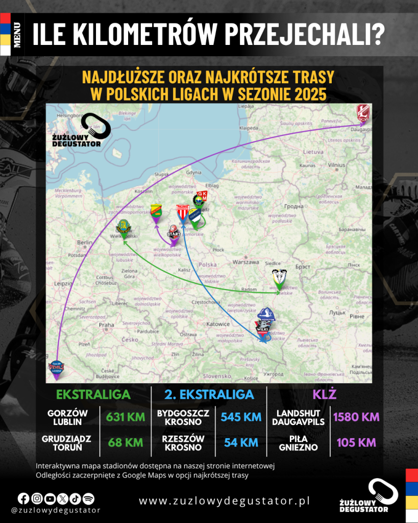 Podsumowując, żużel to nie tylko emocje na stadionie – to także logistyka, wytrzymałość i tysiące kilometrów pokonanych po Polsce i Europie. Najdalsze trasy w KLŻ zahaczały o granice państw, w 2. Ekstralidze zawodnicy pokonywali setki kilometrów po kraju, a w Ekstralidze mierzyli się zarówno z krótkimi, jak i bardzo długimi wyjazdami.