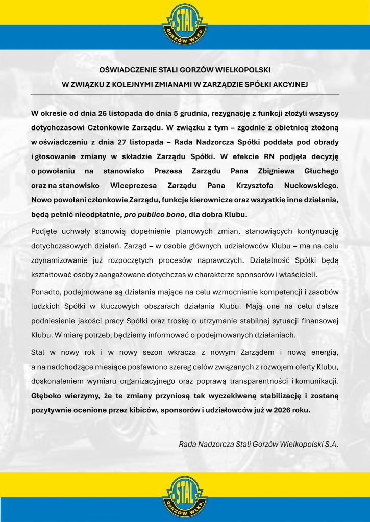 Stal Gorzów Wielkopolski ogłosiła kolejne istotne zmiany personalne w strukturach zarządczych klubu. W okresie od 26 listopada do 5 grudnia wszyscy dotychczasowi członkowie Zarządu złożyli rezygnacje ze swoich funkcji. Jak podkreślono w komunikacie, była to część planowanego procesu przebudowy kierownictwa, który Rada Nadzorcza zapowiadała już wcześniej.