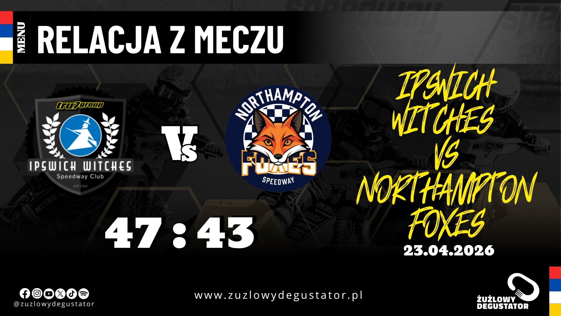 Za Northampton pierwszy mecz sezonu. Pomimo kontuzjowanego Nielsa-Kristiana Iversena (którego w Ipswich również zabrakło) drużyna „Lisów” zdobyła 40 punktów, a każdy członek zespołu zdołał zdobyć trzy płatne punkty. Gospodarze jednak wyglądają w tym sezonie na bardzo mocnych – w końcu bronią mistrzowskiego tytułu. W Witches przoduje mocna para Brennan-King, a dobre punkty przywozi również Richard Lawson i Tobiasz Musielak. W KO Cup wygrali już oba mecze z King’s Lynn Stars, jednak ulegli w inauguracji Premiership w Manchesterze. Pewne jest to, że zarówno Witches jak i Northampton mają swoje problemy tak samo, jak mają o co walczyć w tym sezonie.