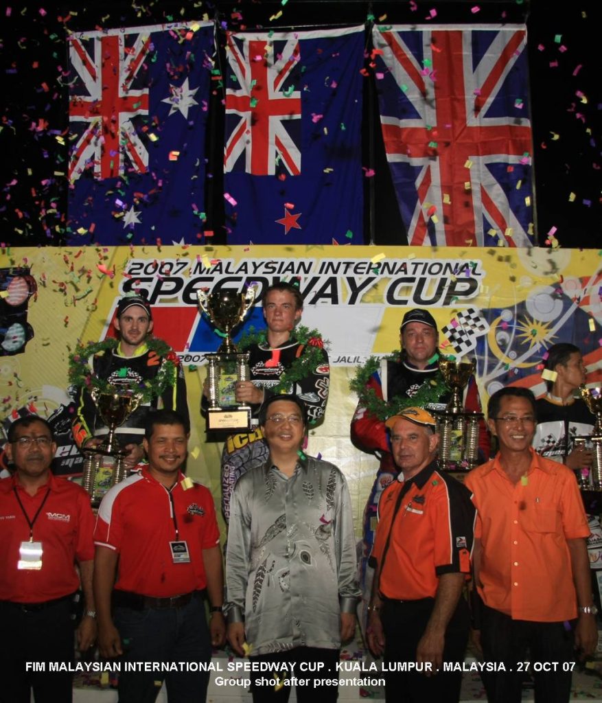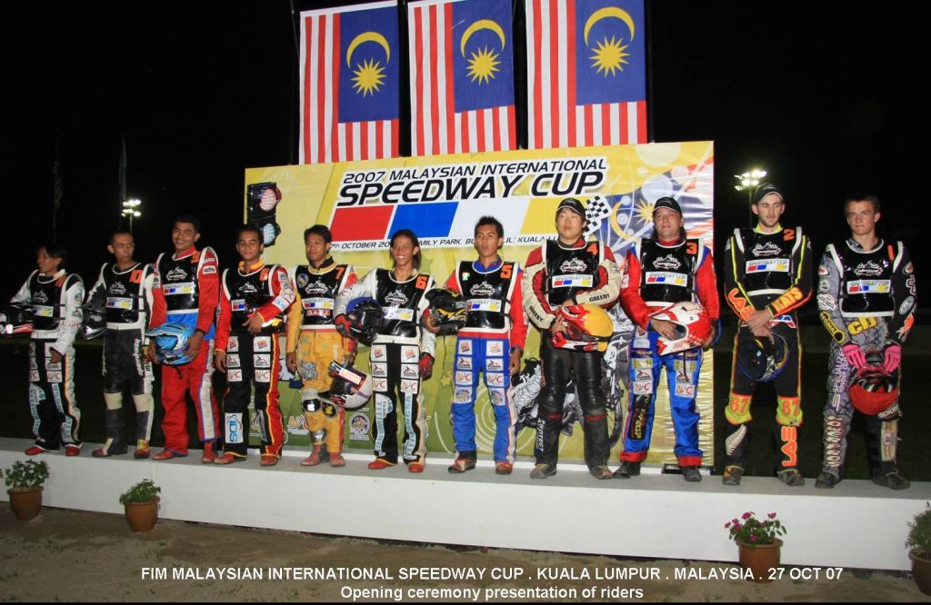 27 października 2007 roku odbył się w tym samym miejscu sankcjonowany przez FIM Malaysian International Speedway Cup. Zwycięzcą zawodów, który na zawsze zapisał się złotymi zgłoskami w księgach malezyjskiego żużla był Nowozelandczyk Ricky Wells. Zawodnik po turnieju nie krył podziwu dla pracy włożonej przez organizatorów i zawodników, którzy w kilka miesięcy nauczyli się (tyle ile mogli) jeździć na motocyklach żużlowych. Drugie miejsce padło łupem australijskiego zawodnika Sama Taylora, a brąz wywalczył Linden Warner z Wielkiej Brytanii (nagranie z biegu finałowego krąży po serwisie YouTube). „Finał pocieszenia” , którego stawką był tytuł najlepszego Malezyjczyka wygrał Mohammad Helmey Hamzah. Malezyjczyk po zawodach powiedział, że żużel odmienił jego życie, zmieniając go z uczestnika nielegalnych wyścigów w profesjonalnego zawodnika. Użył sformułowania, że żużel nauczył go dyscypliny i sprawił, że stał się lepszym człowiekiem – „To najlepsza rzecz, która przytrafiła mi się w życiu”. Zastępca Ministra Młodzieży i Sportu Malezjii Dato’ Liow przyznał, że widzi przyszłość dla tego sportu w swoim kraju. Zwrócił uwagę na stosunkowo niskie koszty organizacji zawodów (w tym czasie w kraju gościła pochłaniające ogromne nakłady finansowe Formuła 1) i wyraził wielką chęć promowania tej dyscypliny, jako dobrego środka wychowawczego dla młodzieży masowo biorącej udział w nielegalnych wyścigach. Jednakże na pięknych obietnicach się skończyło i czarny sport nie miał zbyt długiej kariery w kraju Malajów. Warto wspomnieć, że w rolę konsultanta przy ocenie malezyjskich reprezentantów przed zawodami międzynarodowymi wcielony został legendarny mistrz świata na żużlu Ivan Mauger, o którym więcej opowiemy w kolejnym artykule z serii.
