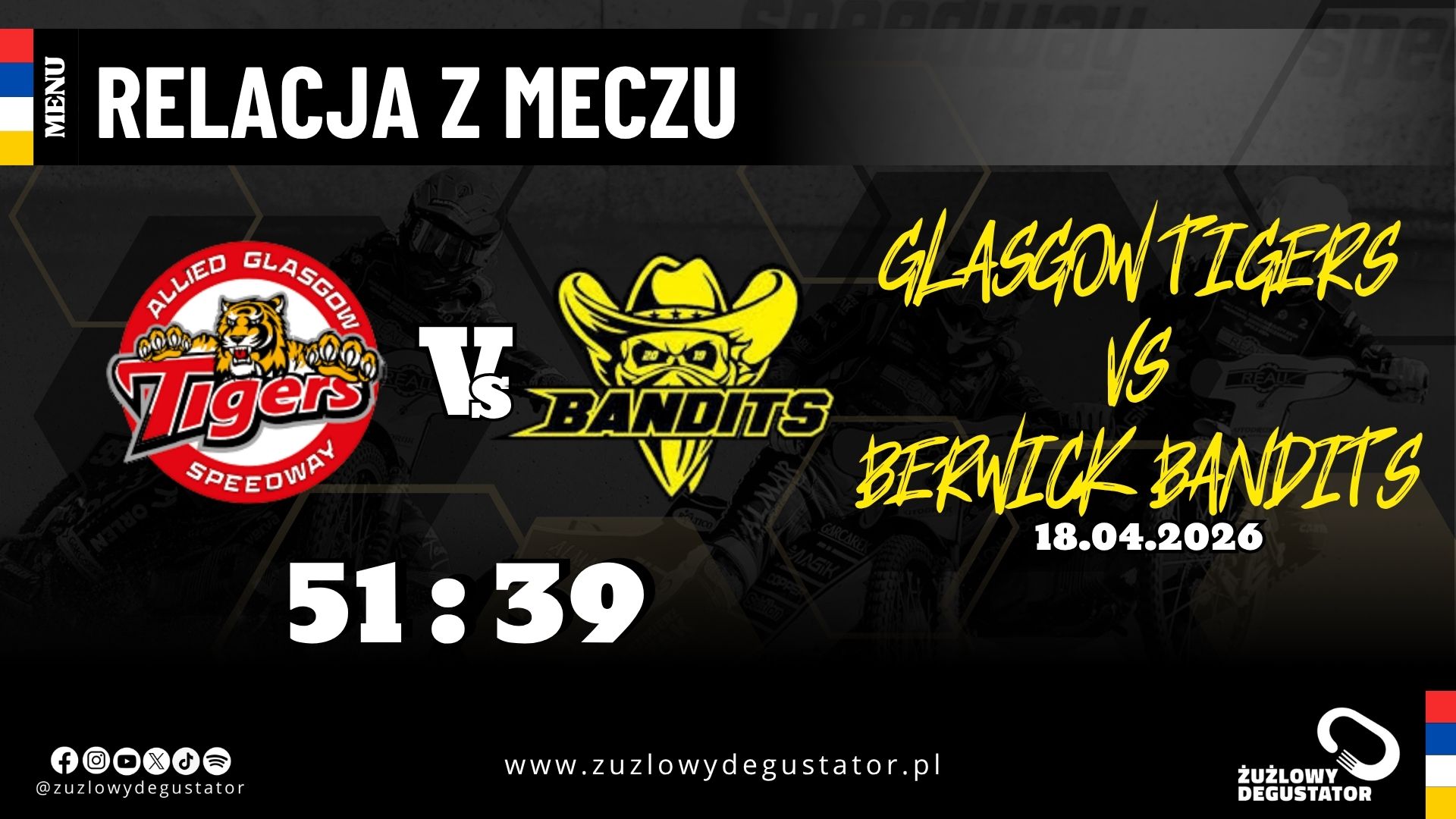 nie przeszkodził on w rozegraniu meczu. Czteropunktowa przewaga utrzymała się do 10. biegu, gdzie „Tygrysy” wygrały 4:2, ustalając wynik 33:27 w spotkaniu. Hagon i Etheridge walczyli ze sobą przez cały 11. bieg, ale ostatecznie zawodnik z Glasgow przekroczył linię mety pierwszy, zdobywając jeden punkt. Para Fredriksen-Battye przywiozła jedyną wygraną dla gości w tym meczu w biegu 14., wygrywając 2:4. Harris zakończył mecz wyprzedzając Palovaarę po zewnętrznej, i dopisał sobie dwa „oczka” z bonusem w ostatnim biegu. Finalnie Glasgow wygrało 51:39 z Berwick Bandits.